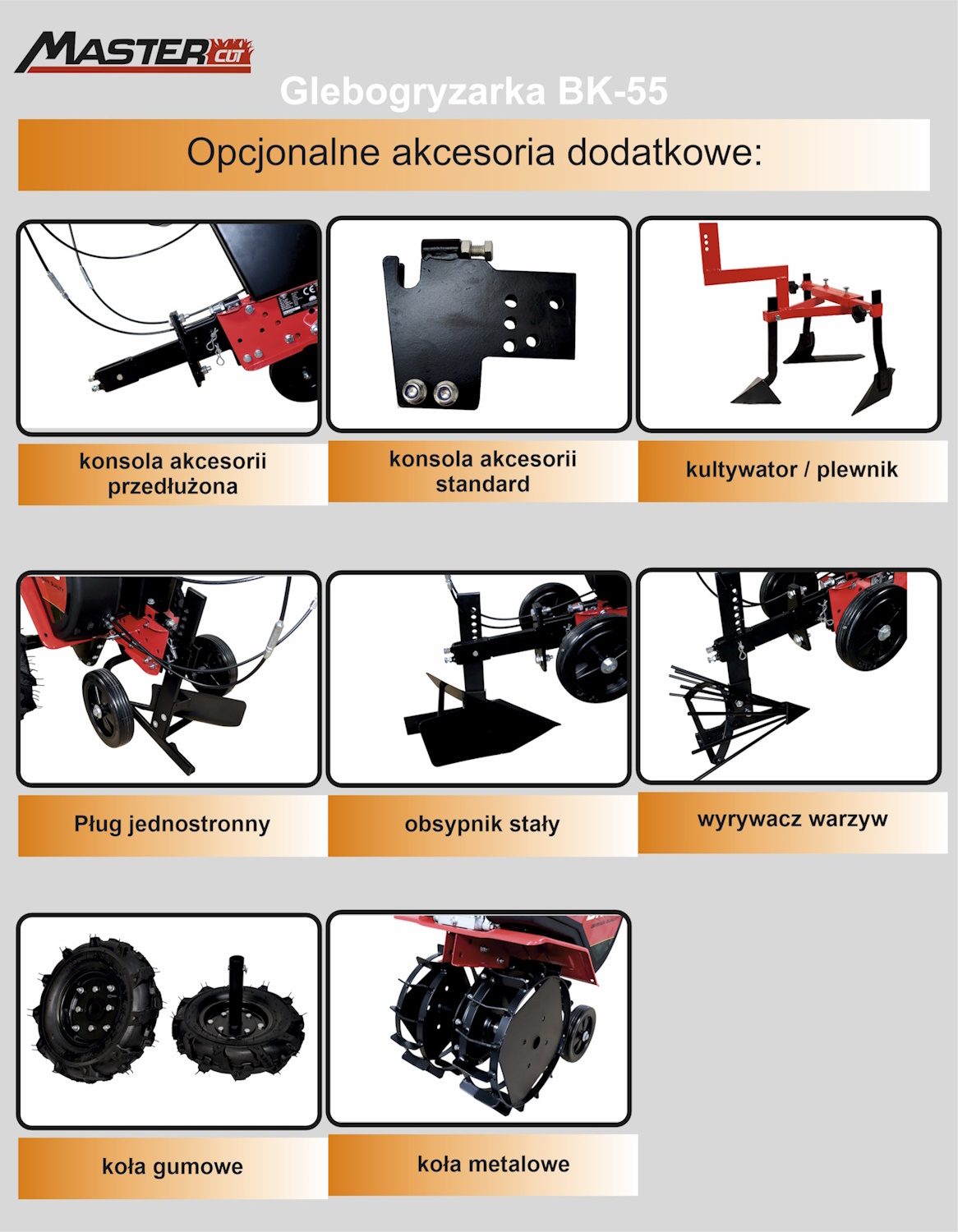 Urządzenie można doposażyć w dodatkowy osprzęt taki jak pług do orki, obsypnik do ziemi, kultywator (plewnik), wyorywacz do warzyw, koła metalowe. Stalowe koła są konieczne, aby można było pracować wymienionym osprzętem. Przy chęci rozbudowy glebogryzarki BK-55-2L o wyżej wymieniony osprzęt nalezy pamiętać o konsoli/adapterze, który nie znajduje się w wyposażeniu podstawowym.