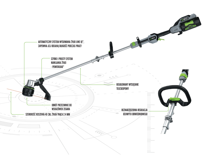 Najnowsza innowacja firmy EGO obejmuje automatyczne czujniki, które automatycznie monitorują i podają długość żyłki, więc koniec z czynnościami „dotknij i idź” w celu podania żyłki do głowicy tnącej. Wraz z opatentowaną przez EGO technologią Powerload™, została zaprojektowana w celu wyeliminowania irytujących problemów, dzięki czemu możesz skupić się na wykonywanej pracy.
